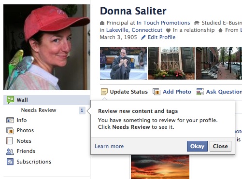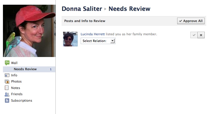 If Facebook thinks you need to review something, they now notify you on your wall. I got a notification that one of my friends added me as a family member. I was asked to review and approve her addition.